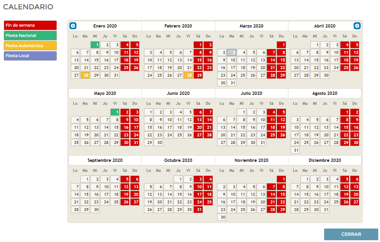Si pulsamos en este icono, accedemos al calendario de la instalación donde se indicarán los días inhábiles.